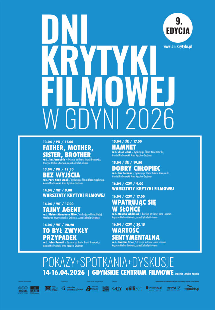 W dniach 13-16 kwietnia, w Gdyńskim Centrum Filmowym imienia Leszka Kopcia, odbędzie się 9. edycja przeglądu Dni Krytyki Filmowej. Seanse wyjątkowych i odważnych filmów, często nagradzanych na światowych festiwalach filmowych, do tego goście i dyskusje z publicznością. Przegląd stwarza przestrzeń do rozmów o kinie, o filmach i tematach, które się w nich pojawiają. Formuła wydarzenia ma zachęcać do świadomego odbioru dzieła filmowego, jego krytycznego oglądu i polemiki z krytykami i znawcami kina.